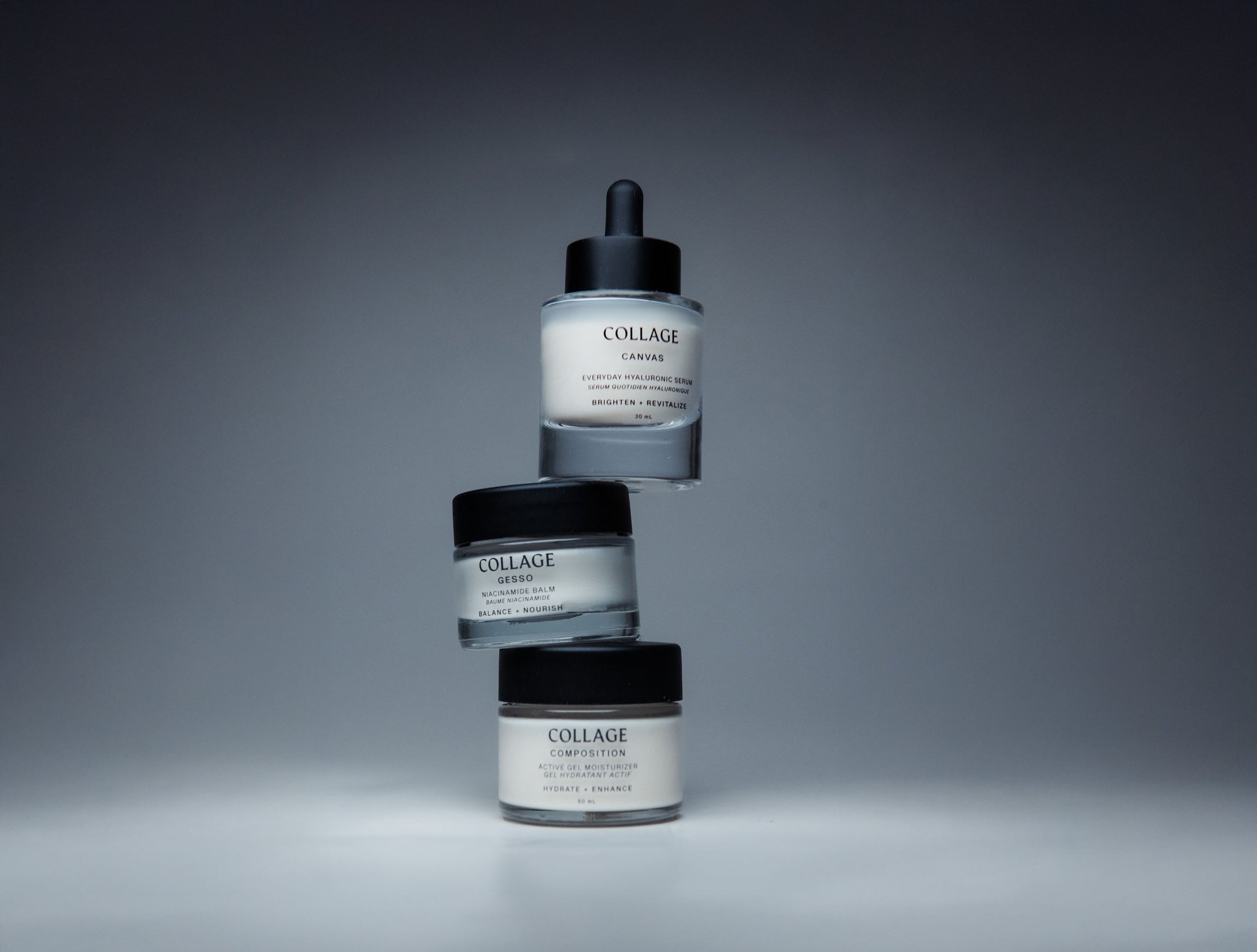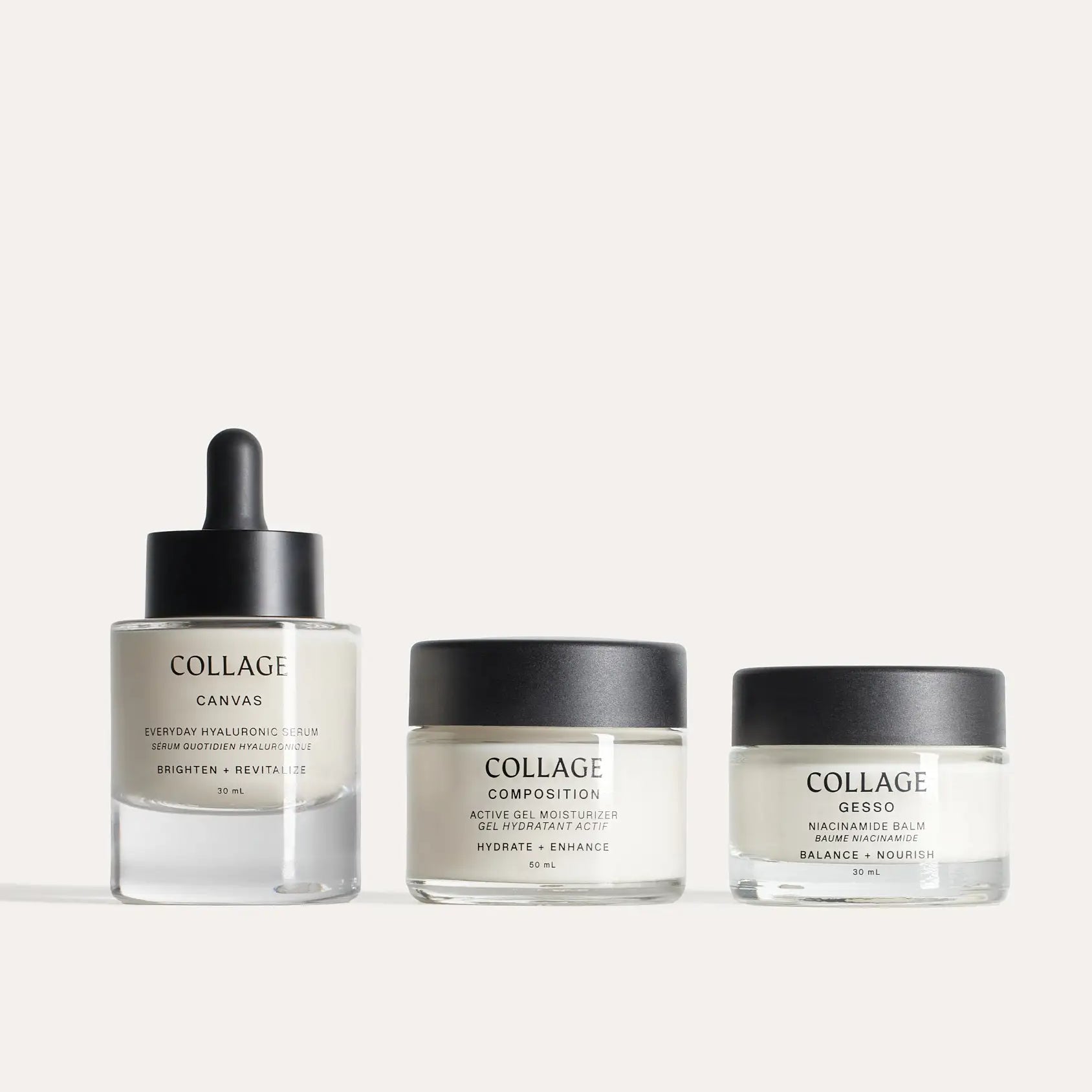 Our 3-step system—Canvas, Composition, and Gesso—is thoughtfully formulated with purposeful ingredients to support your skin at every age and stage. We use proven actives like hyaluronic acid in both high and low molecular weights for deep and surface hydration, along with niacinamide to help strengthen the skin barrier.